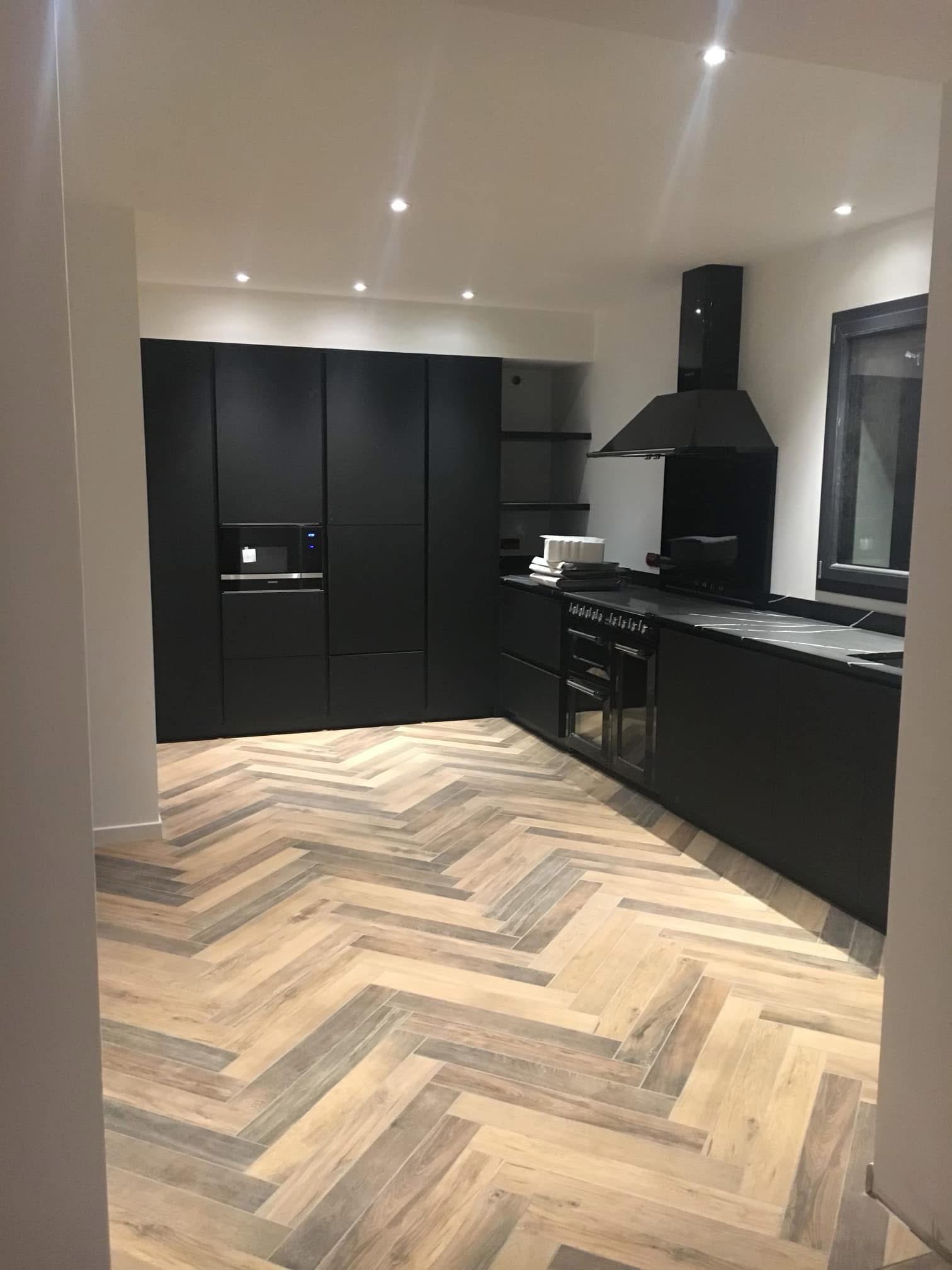 Dans le cadre de ce chantier neuf, notre client a réalisé une pose de carrelage en motif chevron, apportant une touche élégante et contemporaine à l’espace.