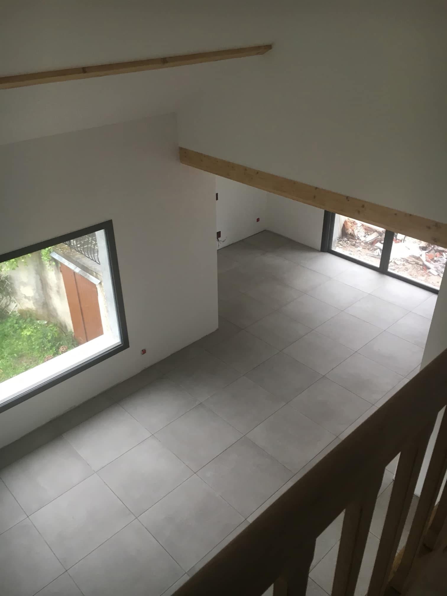 Dans ce chantier neuf, notre client est intervenu pour la pose de carrelage grand format dans une vaste pièce à vivre, baignée de lumière naturelle grâce à de grandes ouvertures.